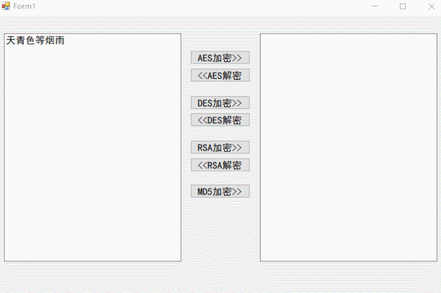 private void btn_Aes_Decrypt_Click(object sender, EventArgs e)        {            string result = AesUtil.Decrypt(textBox2.Text, "12345678900987654321");            textBox1.Text = result;        }