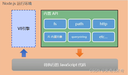 总结: V8引擎负责解析和运行Javascript代码。 内置API是由运行环境 提供的特殊接口,只能在所属的运行环境中被调用 那什么是node.js呢? 和Javascript又是什么关系呢? node.js 提供了 Javascript的运行环境。 当Javascript作为后端开发语言来说, 需要在node.js的环境上进行 当Javascript作为前端开发语言来说,需要在浏览器的环境上进行 Node.js 中的Javascript运行环境?(后端开发) Node.js是一个基于Chrome V8引擎的Javascript 运行环境 (Chrome V8引擎运行效率最高) 如果我们写了一段js代码,把它放在浏览器中运行,那么我们在做前端开发。 如果我们写了一段js代码,把它放在node中运行,那么我们在做后端开发。