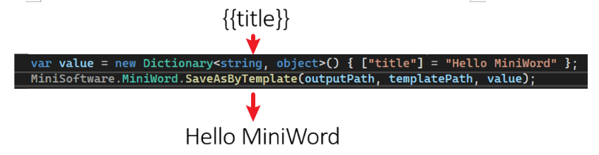 var value = new Dictionary<string, object>(){["title"] = "Hello MiniWord"};