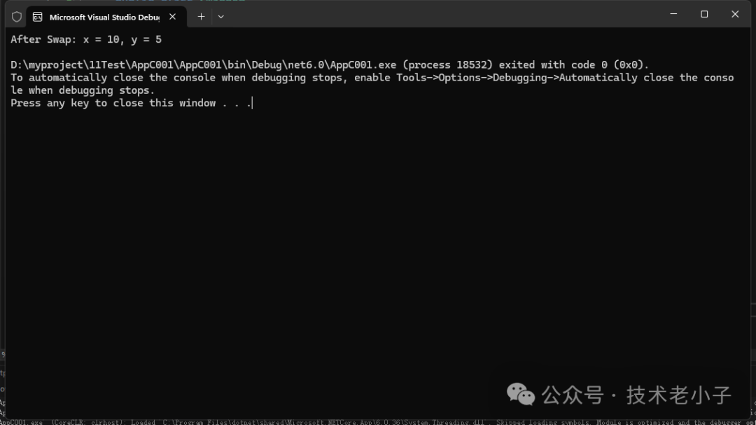 namespace AppC001 { publicclassSwapper { // 使用 ref 交换两个整数的值 publicvoidSwap(ref int a, ref int b) { int temp = a; a = b; b = temp; } } publicclassProgram { publicstaticvoidMain() { // 调用方法 int x = 5; int y = 10; Swapper swapper = new Swapper(); swapper.Swap(ref x, ref y); Console.WriteLine($"After Swap: x = {x}, y = {y}"); // 输出: x = 10, y = 5 } } }