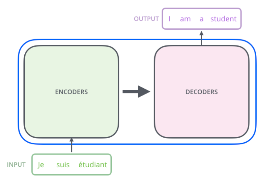 首先把模型看成一个黑盒,如下图所示,对于机器翻译来说,它的输入是源语言(法语)的句子,输出是目标语言(英语)的句子。