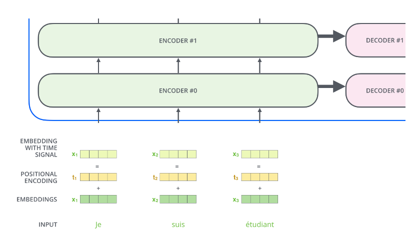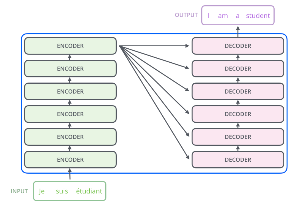 每一个Encoder的输入是下一层Encoder输出,最底层Encoder的输入是原始的输入(法语句子);Decoder也是类似,但是最后一层Encoder的输出会输入给每一个Decoder层,这是Attention机制的要求。