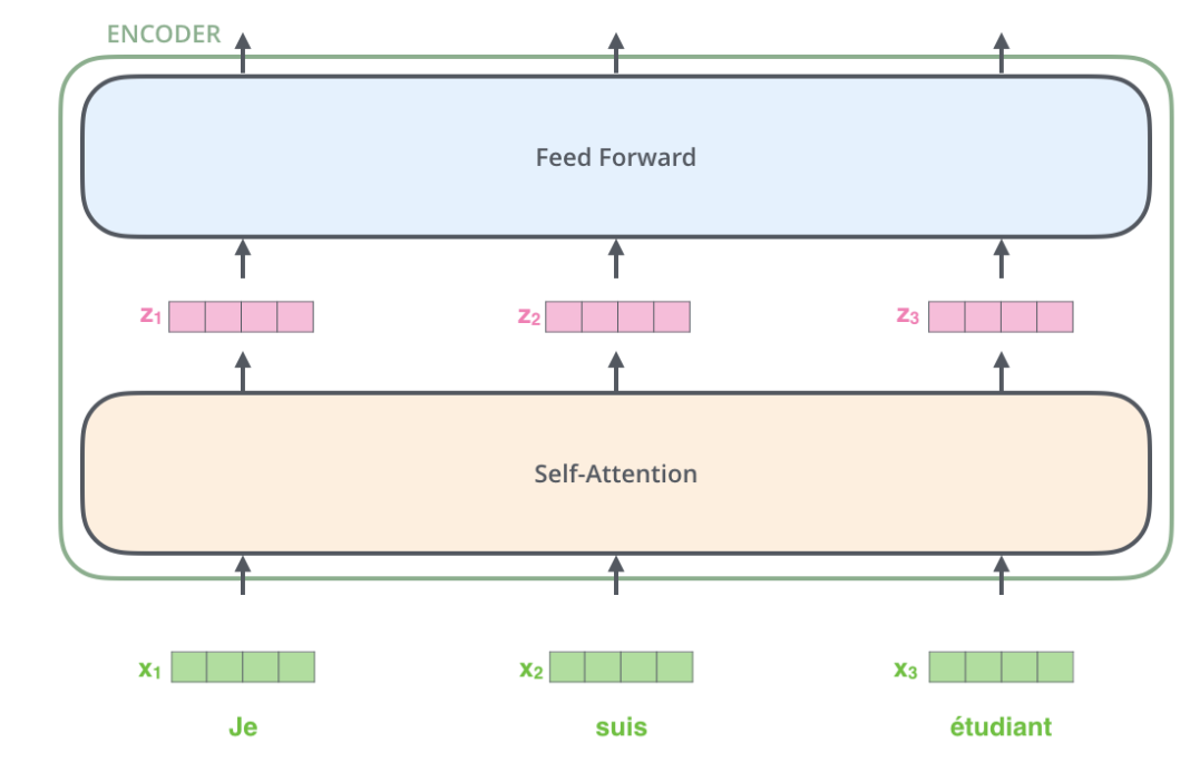 Embedding之后的序列会输入Encoder,首先经过Self-Attention层然后再经过全连接层。