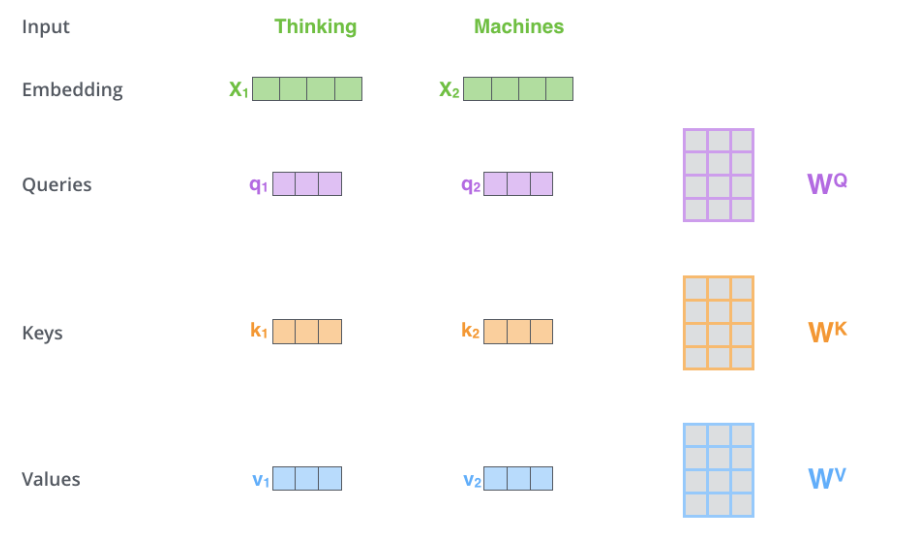 对于输入的每一个向量(第一层是词的Embedding,其它层是前一层的输出),我们首先需要生成3个新的向量Q、K和V,分别代表查询(Query)向量、Key向量和Value向量。Q表示为了编码当前词,需要去注意(attend to)其它(其实也包括它自己)的词,我们需要有一个查询向量。而Key向量可以认为是这个词的关键的用于被检索的信息,而Value向量是真正的内容。