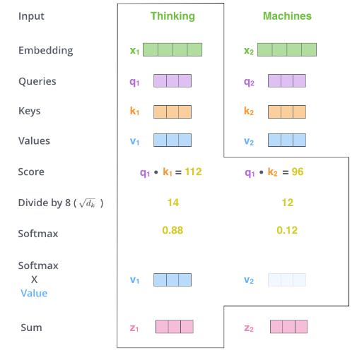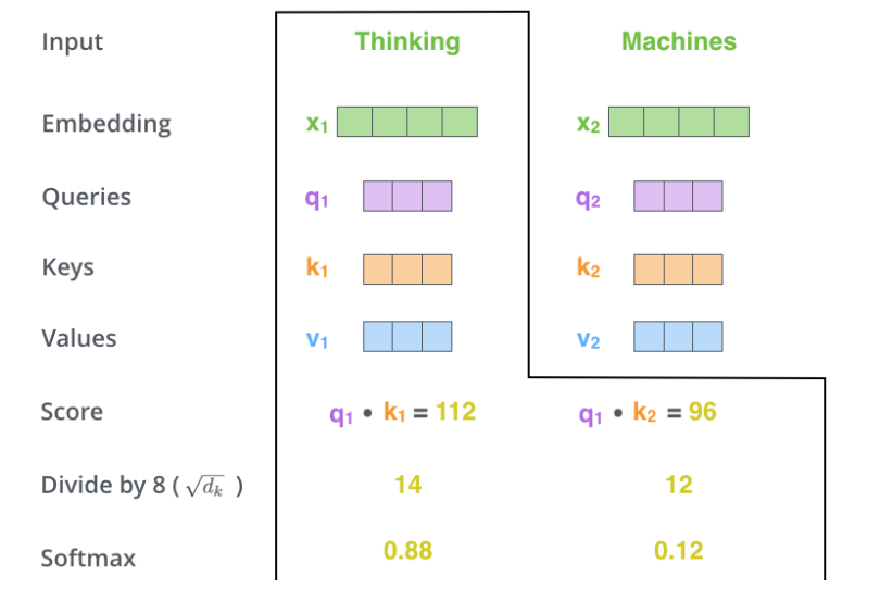 接下来使用softmax把得分变成概率,注意这里把得分除以8(𝑑𝑘)之后再计算的softmax,根据论文的说法,这样计算梯度时会更加稳定(stable)。计算过程如下图所示。