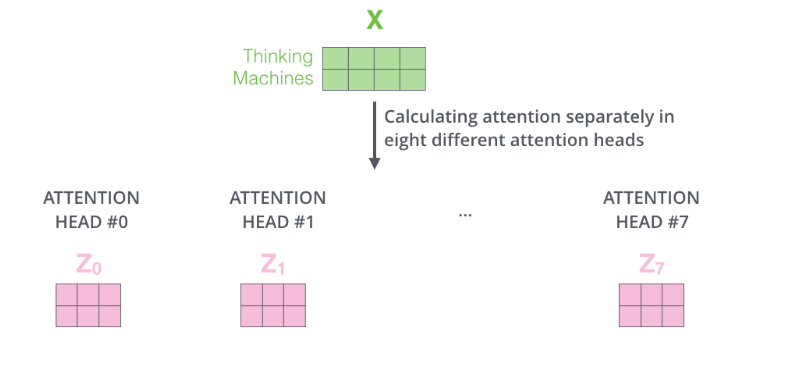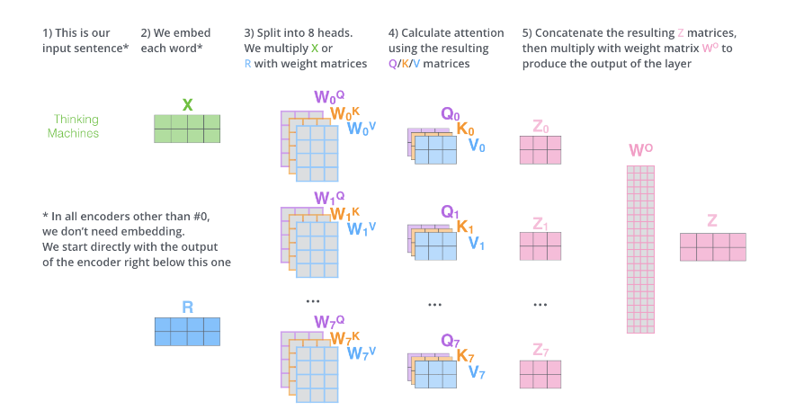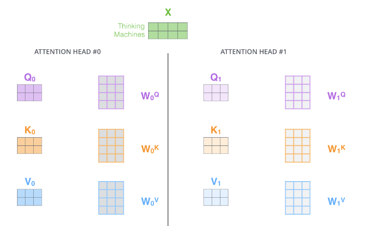 论文还提出了Multi-Head Attention的概念。其实很简单,前面定义的一组Q、K和V可以让一个词attend to相关的词,我们可以定义多组Q、K和V,它们分别可以关注不同的上下文。计算Q、K和V的过程还是一样,不过现在变换矩阵从一组(𝑊𝑄,𝑊𝐾,𝑊𝑉)变成了多组(𝑊𝑄0,𝑊𝐾0,𝑊𝑉0) ,(𝑊𝑄1,𝑊𝐾1,𝑊𝑉1)。如下图所示。