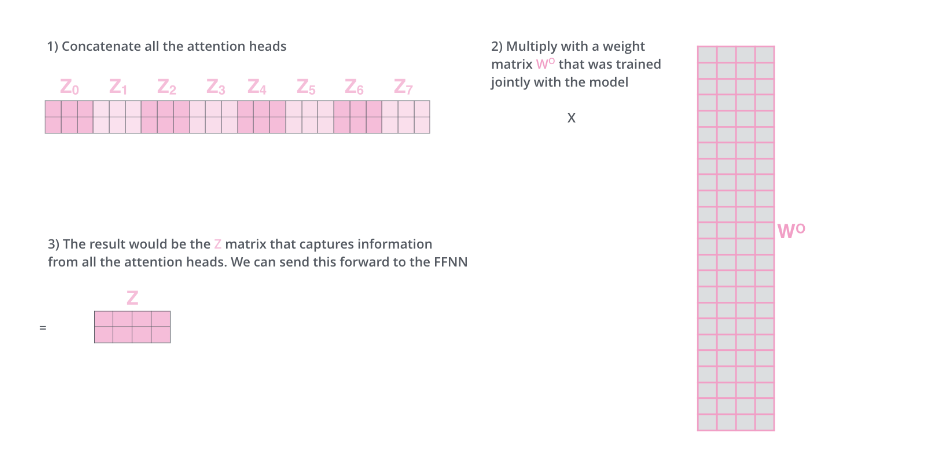 但是后面的全连接网络需要的输入是一个矩阵而不是多个矩阵,因此我们可以把多个head输出的Z按照第二个维度拼接起来,但是这样的特征有一些多,因此Transformer又用了一个线性变换(矩阵𝑊𝑂)对它进行了压缩。这个过程如下图所示。