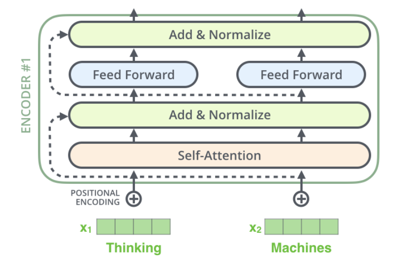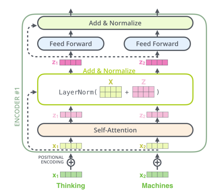 每个Self-Attention层都会加一个残差连接,然后是一个LayerNorm层,如下图所示。
