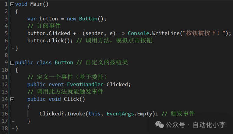 SyntaxEditor Code Snippetvoid Main(){ var button = new Button(); button.Clicked += (sender, e) => Console.WriteLine("按钮被按下!"); button.Click(); }public class Button { public event EventHandler Clicked; public void Click() { Clicked?.Invoke(this, EventArgs.Empty); }}