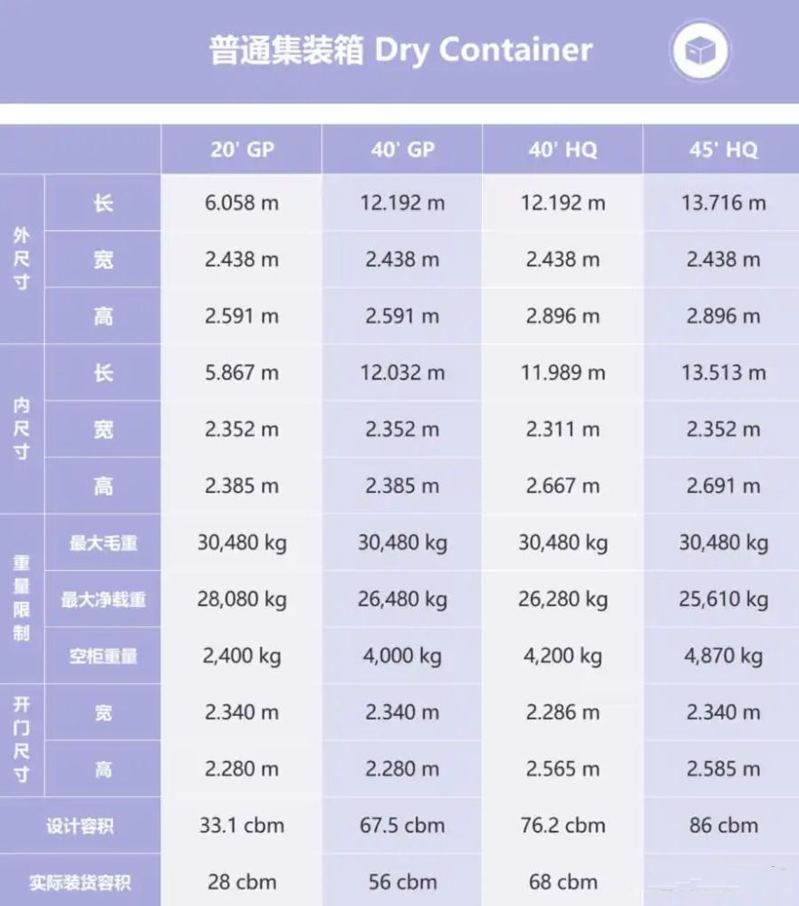 40GP的集装箱:配货毛重为22吨,体积为67.5平方米(正常装58方);内部尺寸:12.032×2.352×2.385;外部尺寸:12.192×2.438×2.591,下图为40GP的集装箱