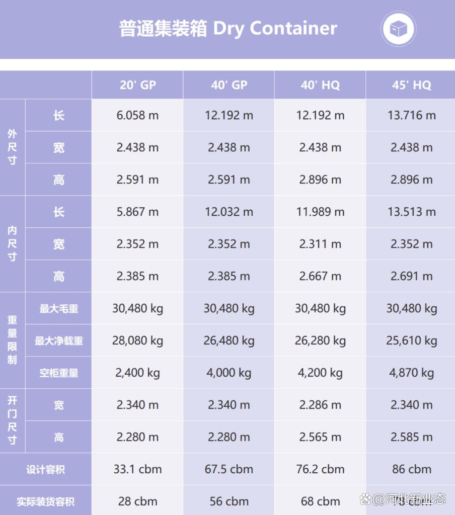 普柜有四种尺寸,具体尺寸信息见下图。其中最有代表的两个尺寸是 20′ GP 和 40′ HQ,也就是外贸行业中常说的 20 尺小柜和 40 尺高柜。