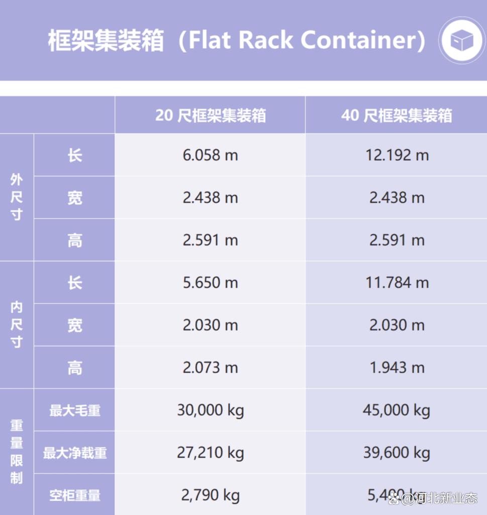 框架集装箱(Flat Rack Container)通常只有底部和两端的支撑结构,没有侧板和顶板。这种开放设计允许装载和卸载大型或超高货物,适合需要起重机吊装的货物。和开顶集装箱一样,其顶部和侧面需要用防水蓬覆盖保护。