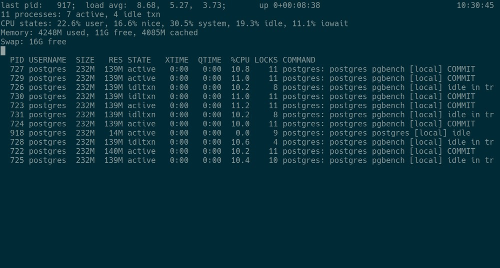 Run Queue Size —— 当前处于 R 状态的任务数 Process List Size —— 系统进程 (线程) 总数 blocked —— 当前处于 D 状态 (不可中断,等待 I/O 完成) 的任务数, 值大表明正在卡磁盘 / 网络 / NFS / 复制;常与 iostat %util & await 一起看 数据库负载前面聊完了系统负载,那么关于数据库,如何去衡量"负载"这个指标呢?操作系统和数据库毕竟是分开的,数据库跑在操作系统之上,严格来说它们是系统的指标,而非数据库软件自身的指标,数据库自身也可能因为各种原因出幺蛾子。 因此,回到数据库自身,是否有类似的负载指标?很可惜,原生 PostgreSQL 并没有类似这样的指标,但是我们知道,一些 CLI 工具是包含 LOAD 这个指标的,比如 pg_top、pg_activity、pg_views 等等。以 pg_top 为例: ![]() 那么这个 load 是如何计算出来的呢?可惜的是,pg_top 本身 从不计算 负载,只负责"搬运 + 排版"。
