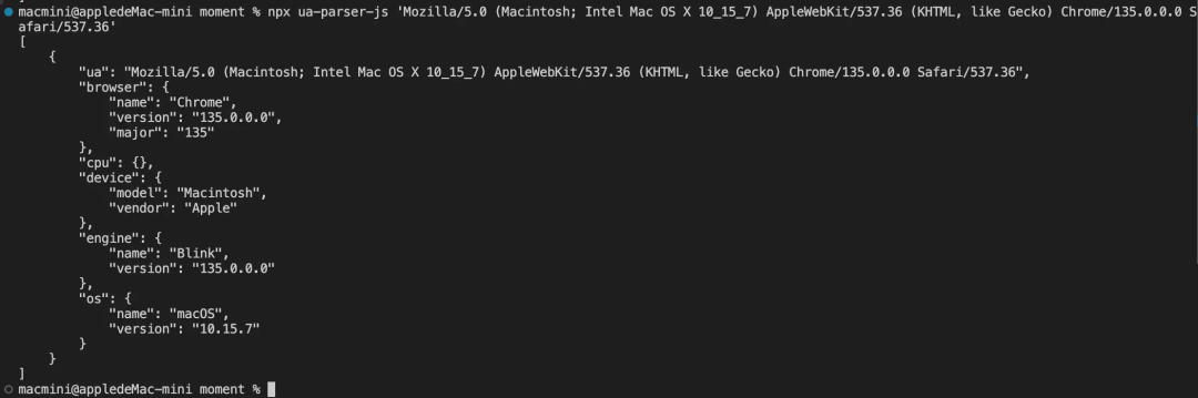 npx ua-parser-js 'Mozilla/5.0 (Macintosh; Intel Mac OS X 10_15_7) AppleWebKit/537.36 (KHTML, like Gecko) Chrome/135.0.0.0 Safari/537.36' 最终输出结果如下图所示;