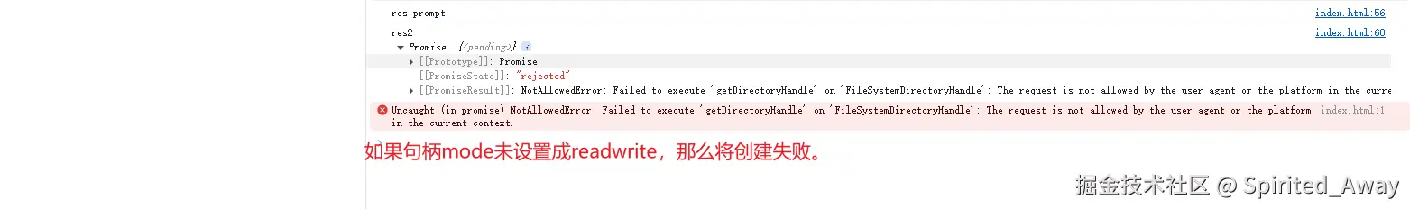 成功选择后,将返回FileSystemDirectoryHandle对象,如果取消(关闭系统弹框或者点击取消)时,将返回一个失败的Promise。