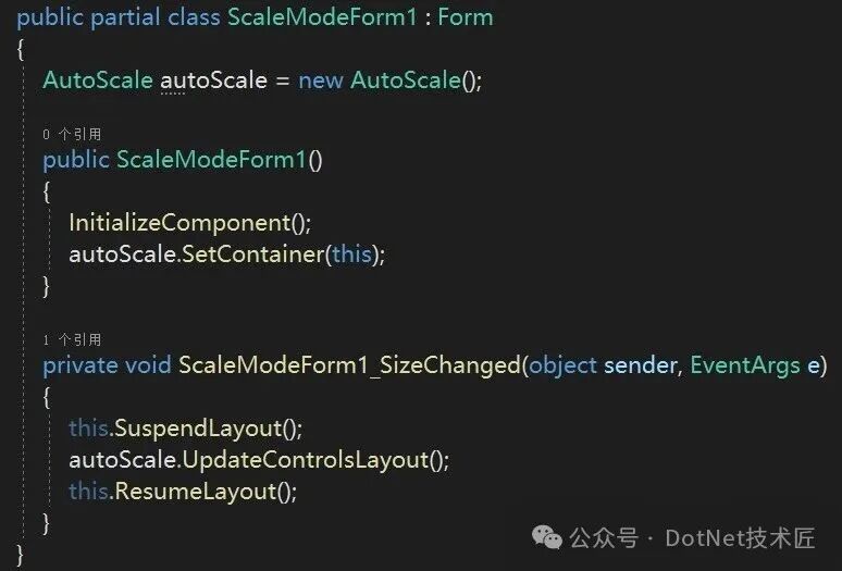 在窗体的 SizeChanged 事件中初始化 AutoScaleHelper 实例,并指定缩放区域(容器):