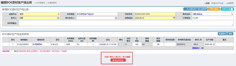 7.查询出来后,找到对应的物料信息,确认是否已经出库。待出库的话就按图操作:先审核确认出库,然后再进行BOE上传。 注:如果在第4步是选择“提交立即出库”可以直接上传BOE