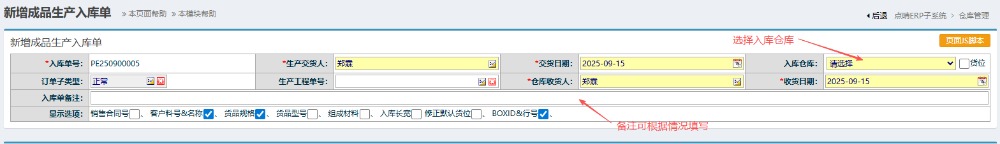 2.进入界面后,按图操作:选择好对应入库仓库。备注可根据情况填写。