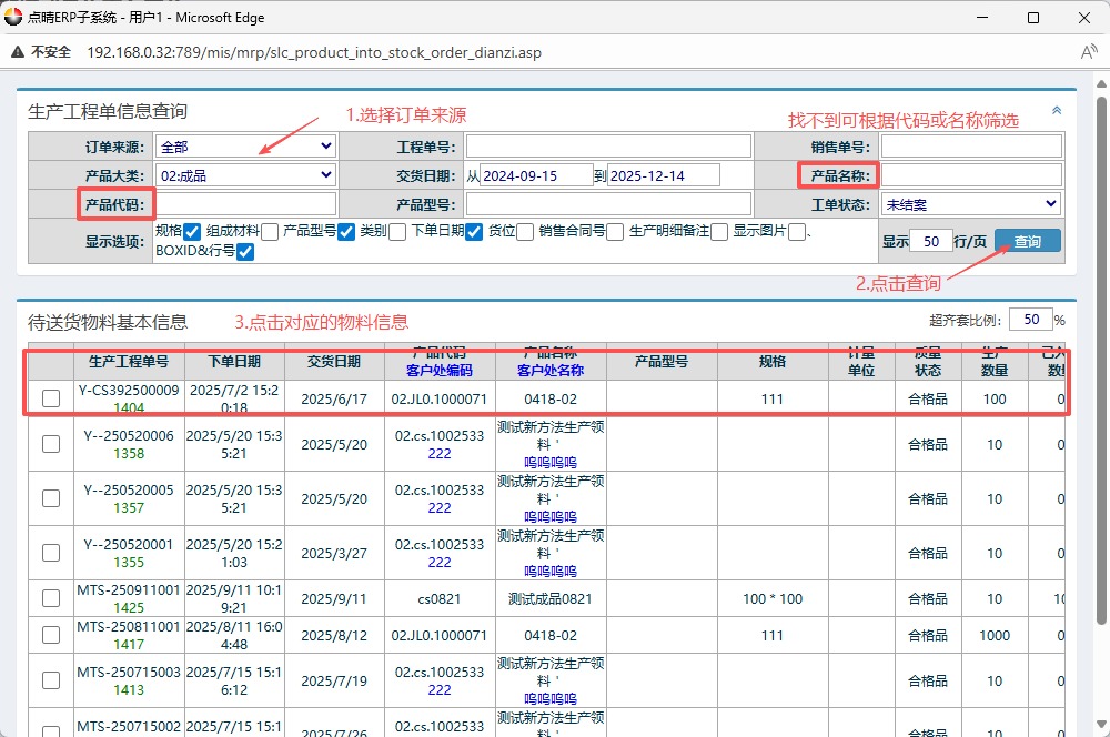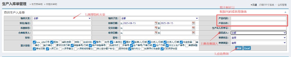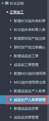 :点晴ERP-BOE成品入库流程![]() 1.进入ERP系统之后,点击“BOE定制”,点开“正常加工”,然后找到“新增成品生产入库单”。