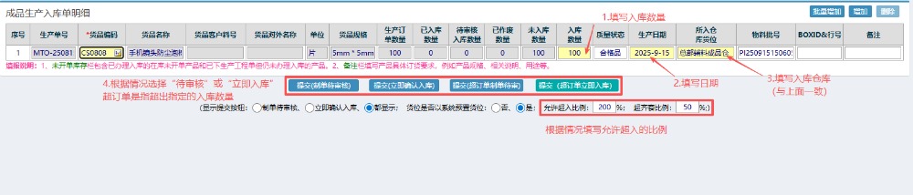4.选好物料后,按图操作:填写入库数量、日期以及入库仓库(与上面一致)。 根据情况选择“待审核”或者“立即入库”。如果有超入的情况下,需要设置好超入的比例。 超入:指超出入库订单指定的数量。