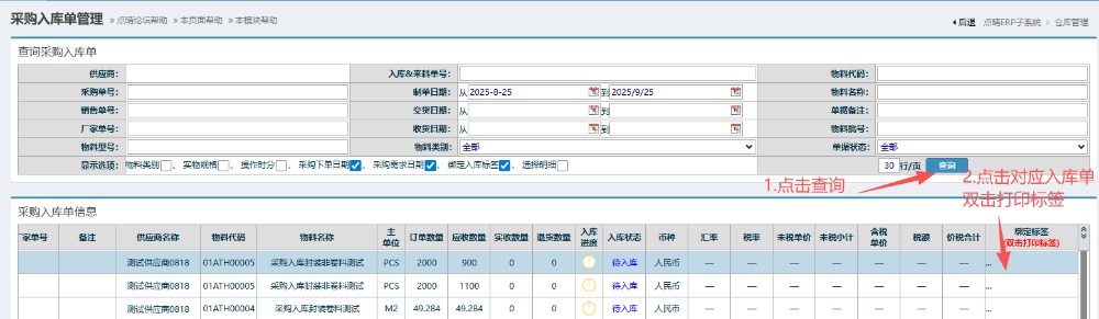 6.进入界面后,点击查询,然后找到对应入库单点击并拉到最右边双击打印标签,会弹出信息窗口。