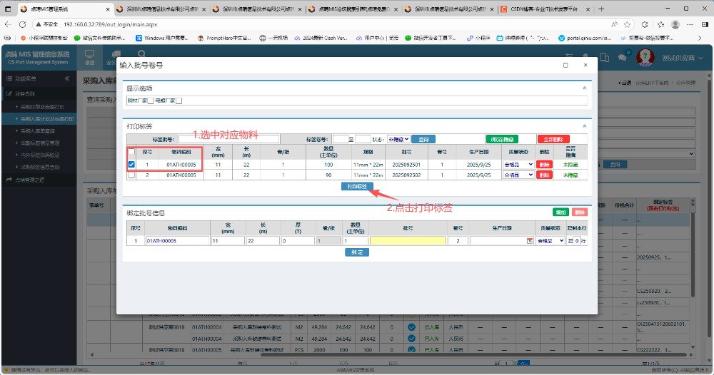 绑定之后,在页面内左手边选好对应物料进行勾上,点击打印标签。