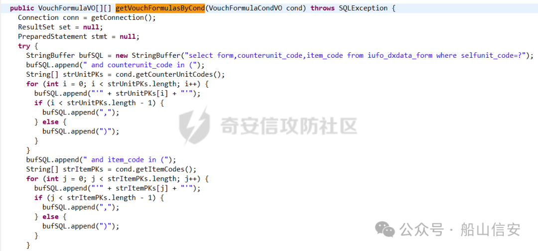 它用for循环将数组里面的字符串进行拼接,以and counterunit_code in (开头,最后再以)结尾闭合括号