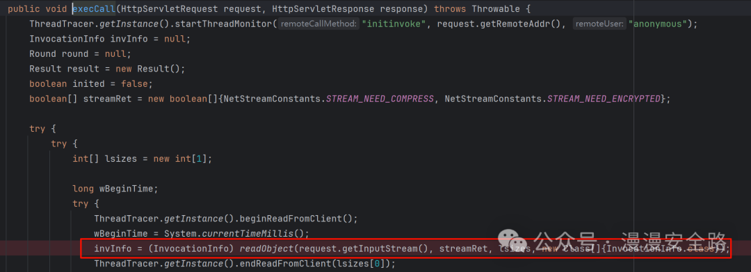 execCall里会调用readObject但是这个方法是他自己实现的