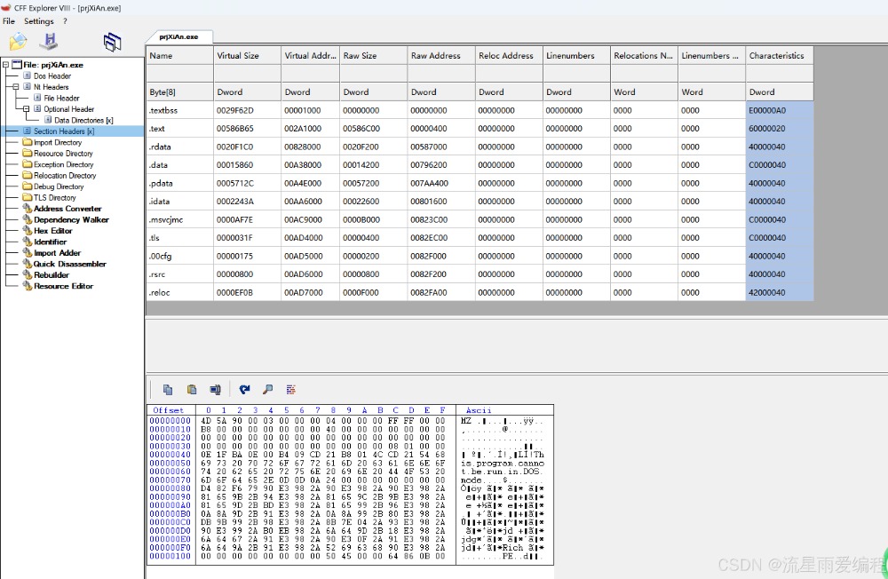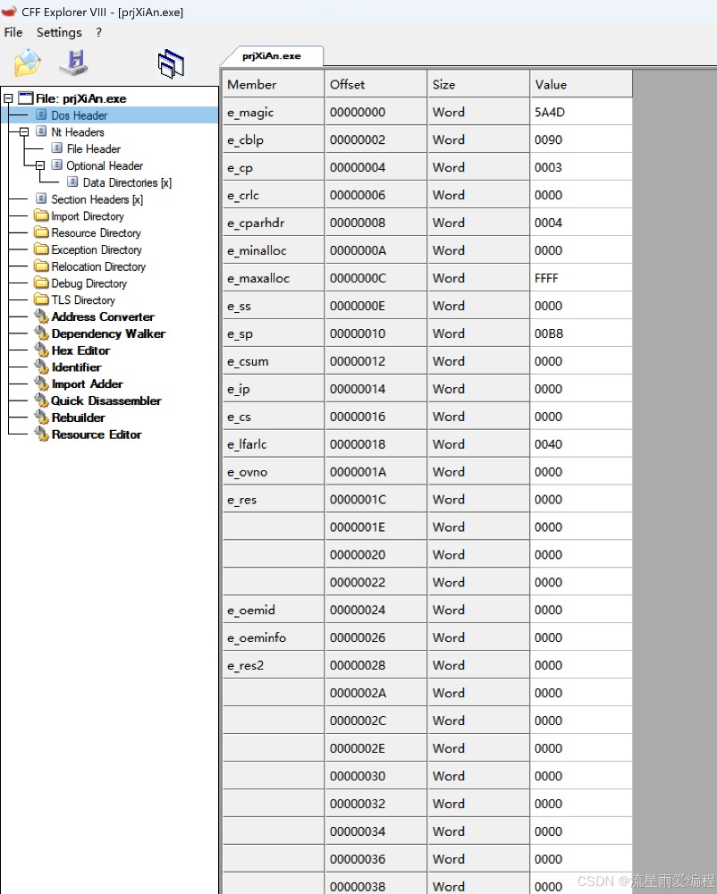 1.功能介绍CFF Explorer 是一款专为 Windows PE 文件(如 EXE、DLL、SYS)设计的多功能工具,核心功能包括深度结构分析、可视化编辑和逆向工程辅助。它由 Daniel Pistelli 开发,支持 PE32/PE64 格式,提供图形化界面和脚本扩展,广泛应用于软件调试、恶意代码分析、资源修改等场景。 1.PE 文件深度解析结构可视化:直观展示 PE 文件的 DOS 头、NT 头、节表、导入表、导出表、资源节等核心组件,支持字段级编辑。 高级分析: