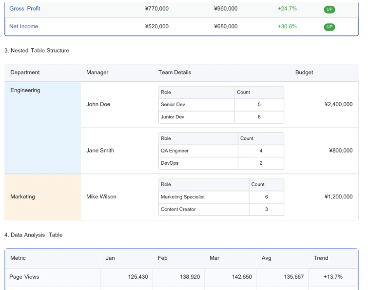 | 声明式 API,易于使用 支持表格、图表等 模板化程度高 | 不支持 HTML 直接转换 需要重新构建文档结构 样式定制能力有限 复杂布局实现困难 |